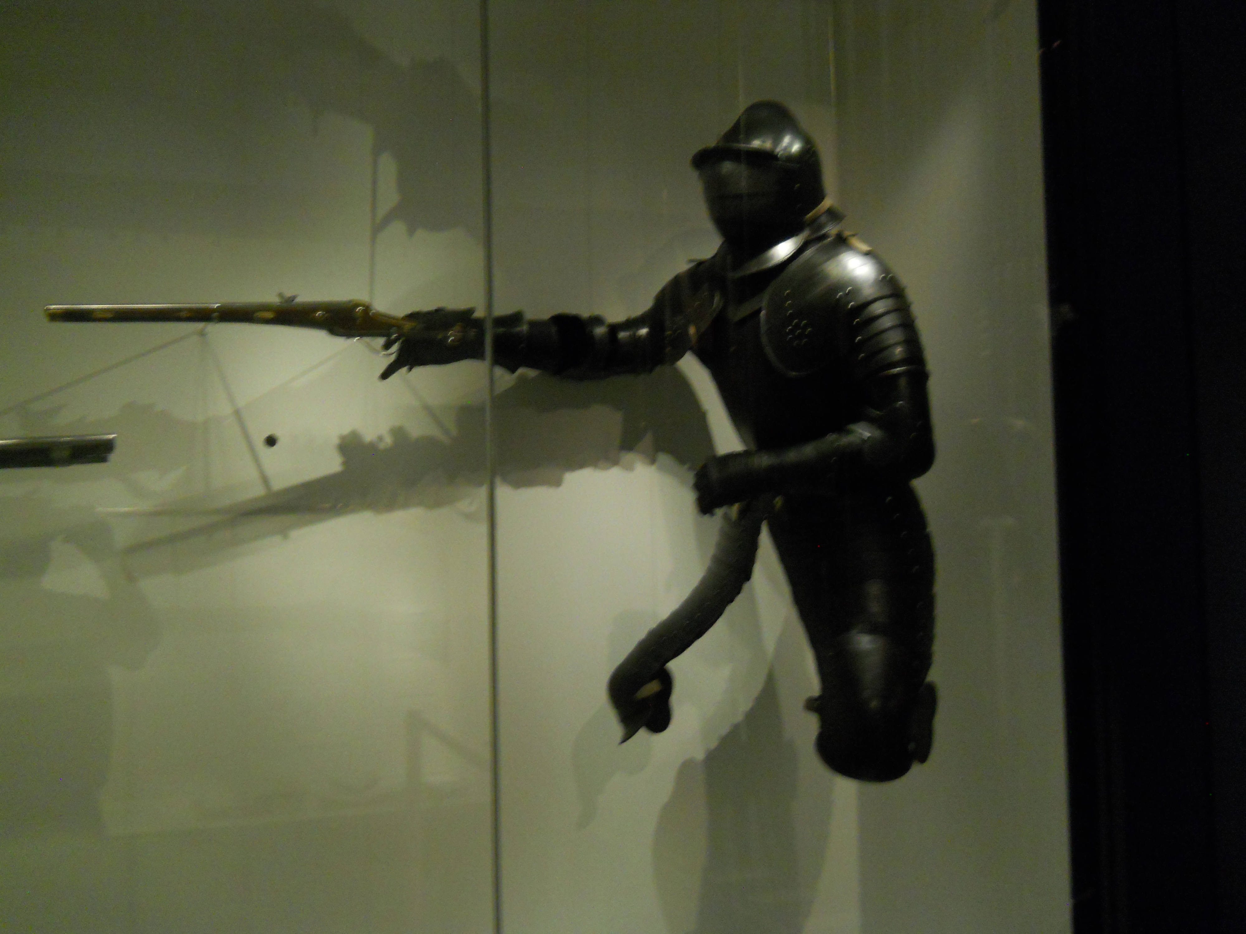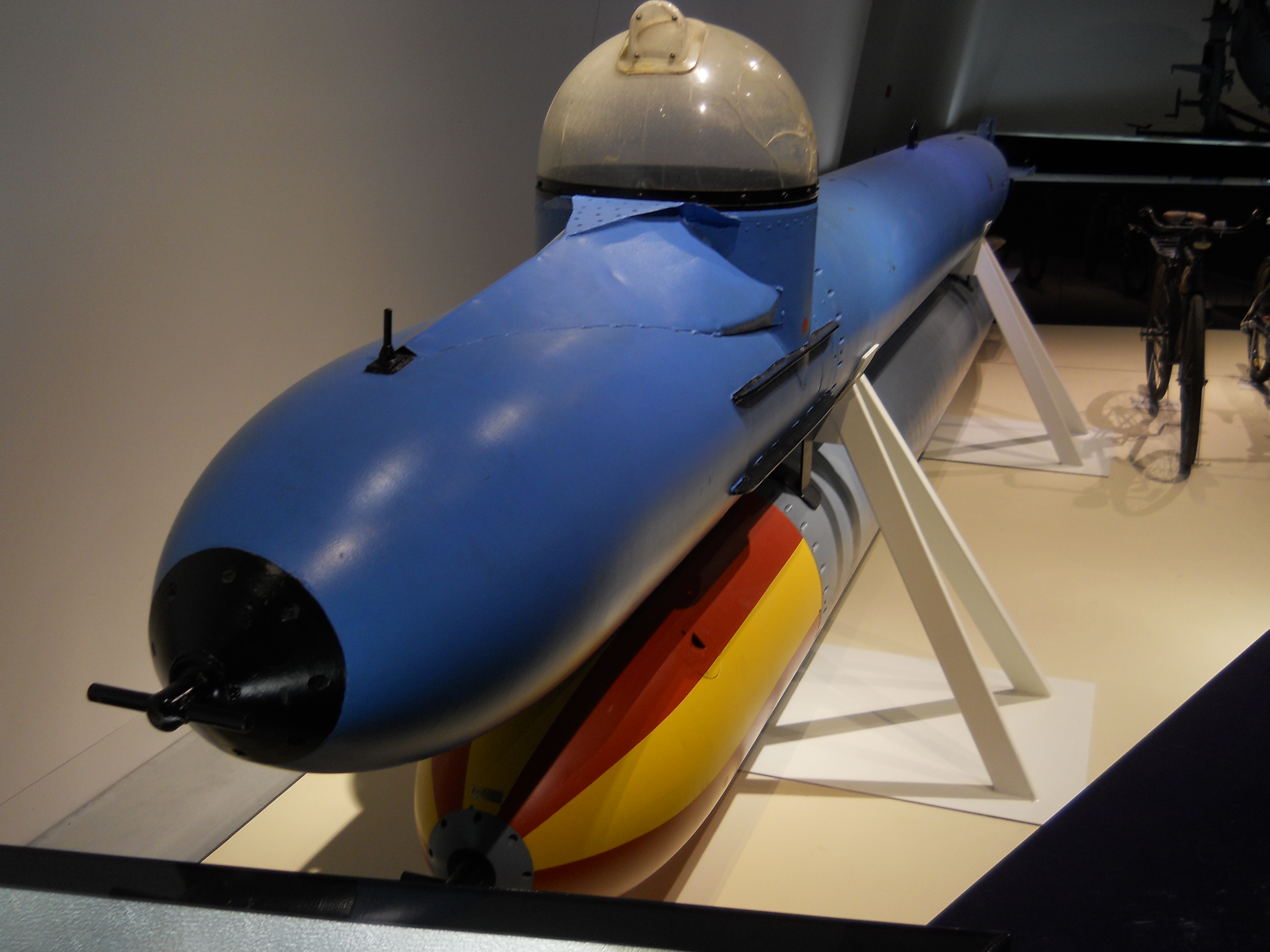 Waste not, want not. This was an old medieval Bombard which would originally have been mounted on a sled-like, wheelless, base – but as technology progressed, the owners had it mounted on a wheeled carriage, probably in the early Renaissance. It is unlikely it saw much use in that form, however, as it was simply too bloody heavy to drag around at any speed, even for use in Sieges.Reiter’s armour and long barrreled wheellock pistol of the sort used during the 30 years war. The Reiter would, typically, be used in a caracole – the formed a circle in front of the enemy and rode around in the circle at speed, firing their pistols into the enemy formation at the nearest point … and, theoretically, if/when the enemy broke they could charge … or other shock-cavalry units such as Curaissers could do so. Typically they had at least four wheellock pistols, and might have as many as six.Neger manned torpedo. It was based on a standard torpedo – it couldn’t submerge but it could carry a real torpedo slung underneath. A really marginal weapon idea – about 200 were manufactured and deployed and 80% of the crews died, often because the darn things simply capsized and they were difficult to escape from. They managed to sink one DD and three Minesweepers.