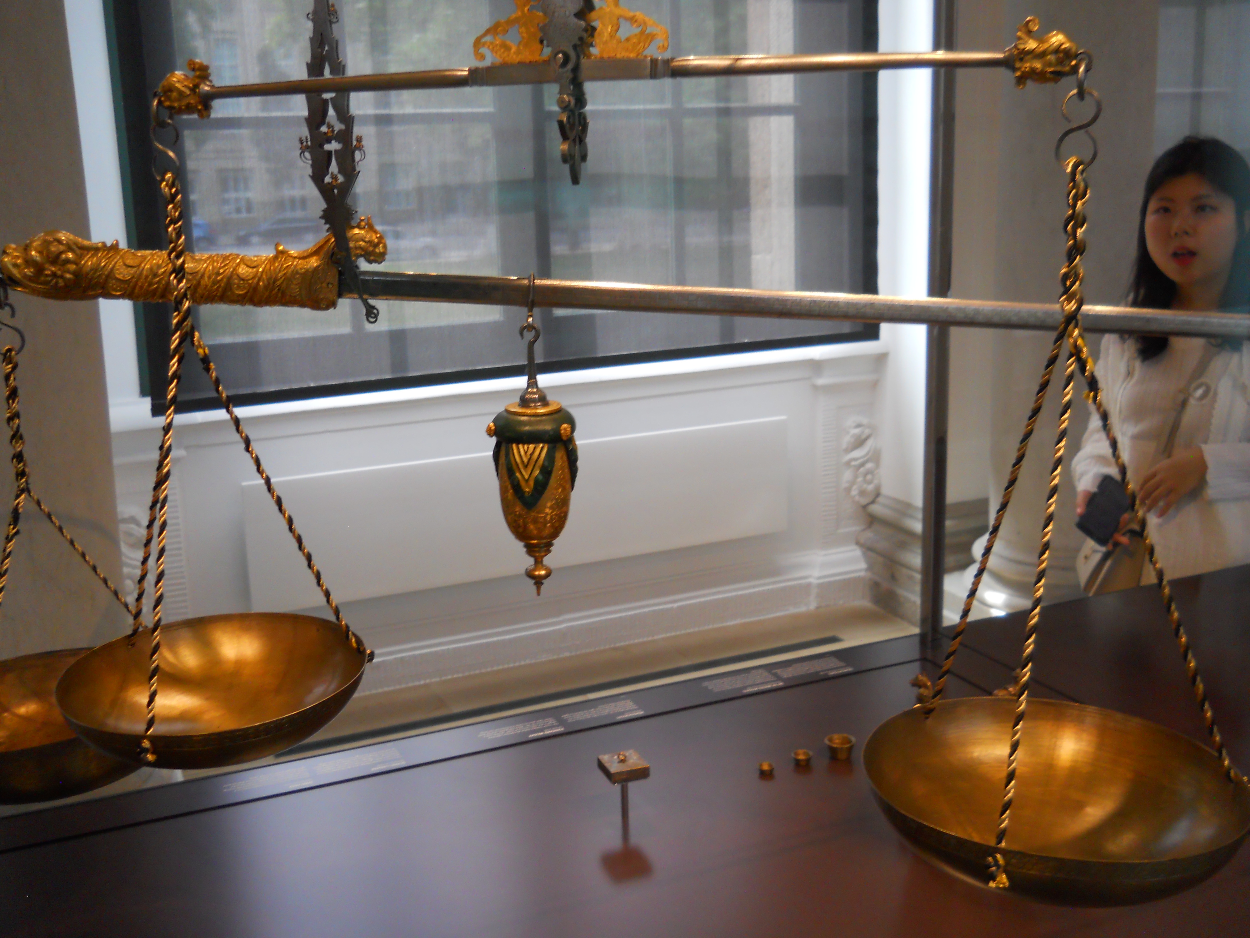 This is a magnetic compass, of course, and, as you can see, it is a gimballed one – that is, it is designed so that it will retain a stable orientation regardless of how its contained moves. Normally this would be used aboard ship – but, in order to carry out accurate surveys of their domains, rulers needed accurate measurements … and so a gimballed compass often accompanied them when they were surveying.And, of course, they needed geometrical tools – but, being princely types, ordinary ones weren’t good enough … as you can see.Pocket Sundials with corrections for various latitudes were also handy before the development of decently accurate clocks.Likewise, weighing things was a necessity … and accurate fancied up Scales were part of the princely equippage.And that’s probably about the only picture of me you’re likely to see. It does show, however, how piss poorly the lighting mixed with glass cases interact to make photgraphy virtually impossible in many cases. You’ll also note that, if you look closely, all of the photos here are fuzzy … no flash photos allowed and the rubbish lighting effects coupled with the glass reflections meant that exposure time was so long … a second or two … that I couldn’t get a decent focussed shot of, oh, pretty much anything.A mechanical calculator – the type created by Blaise Pascal. IIRC this one was actually made in his French workshop and purchased by the ruler.
