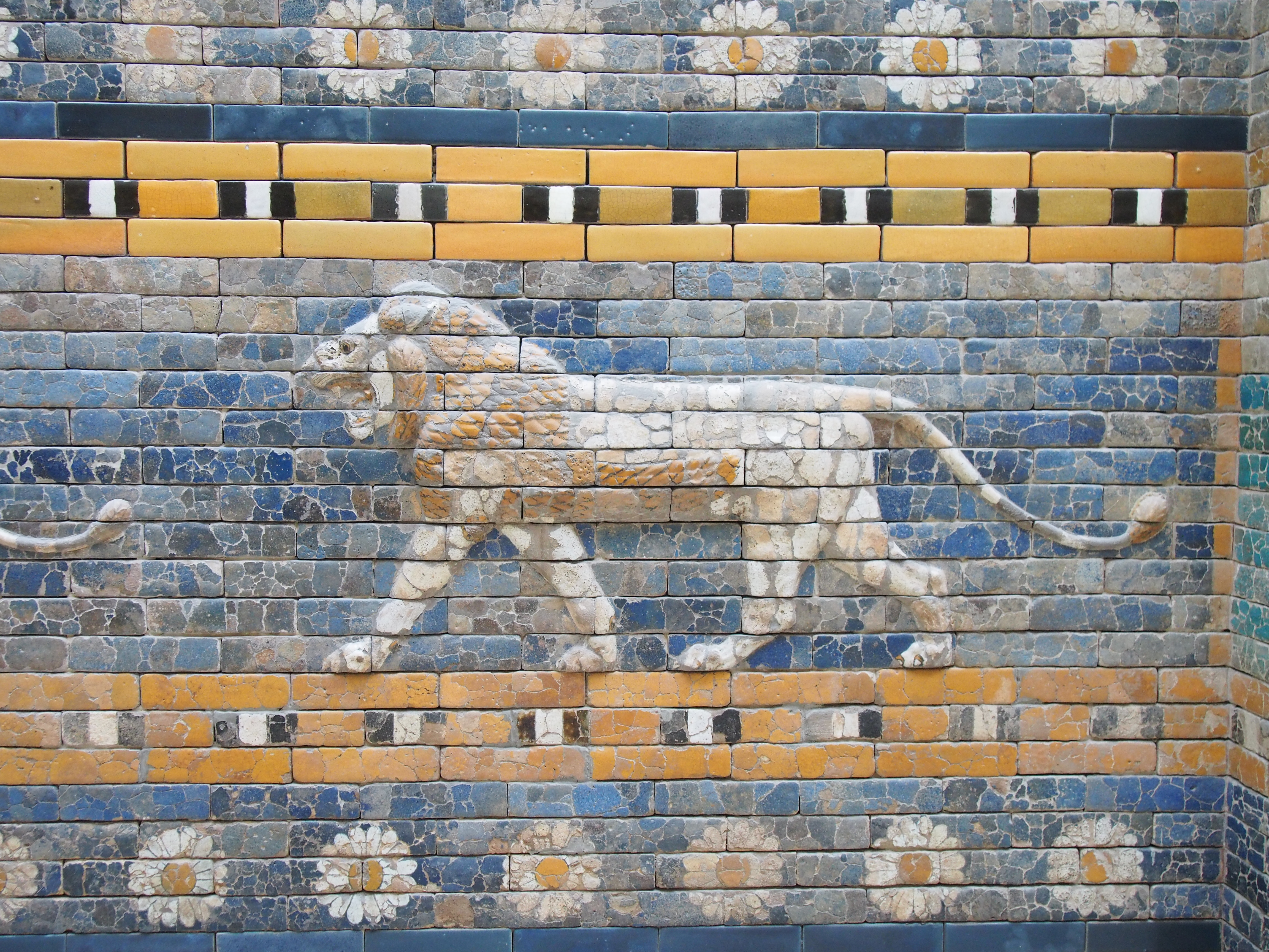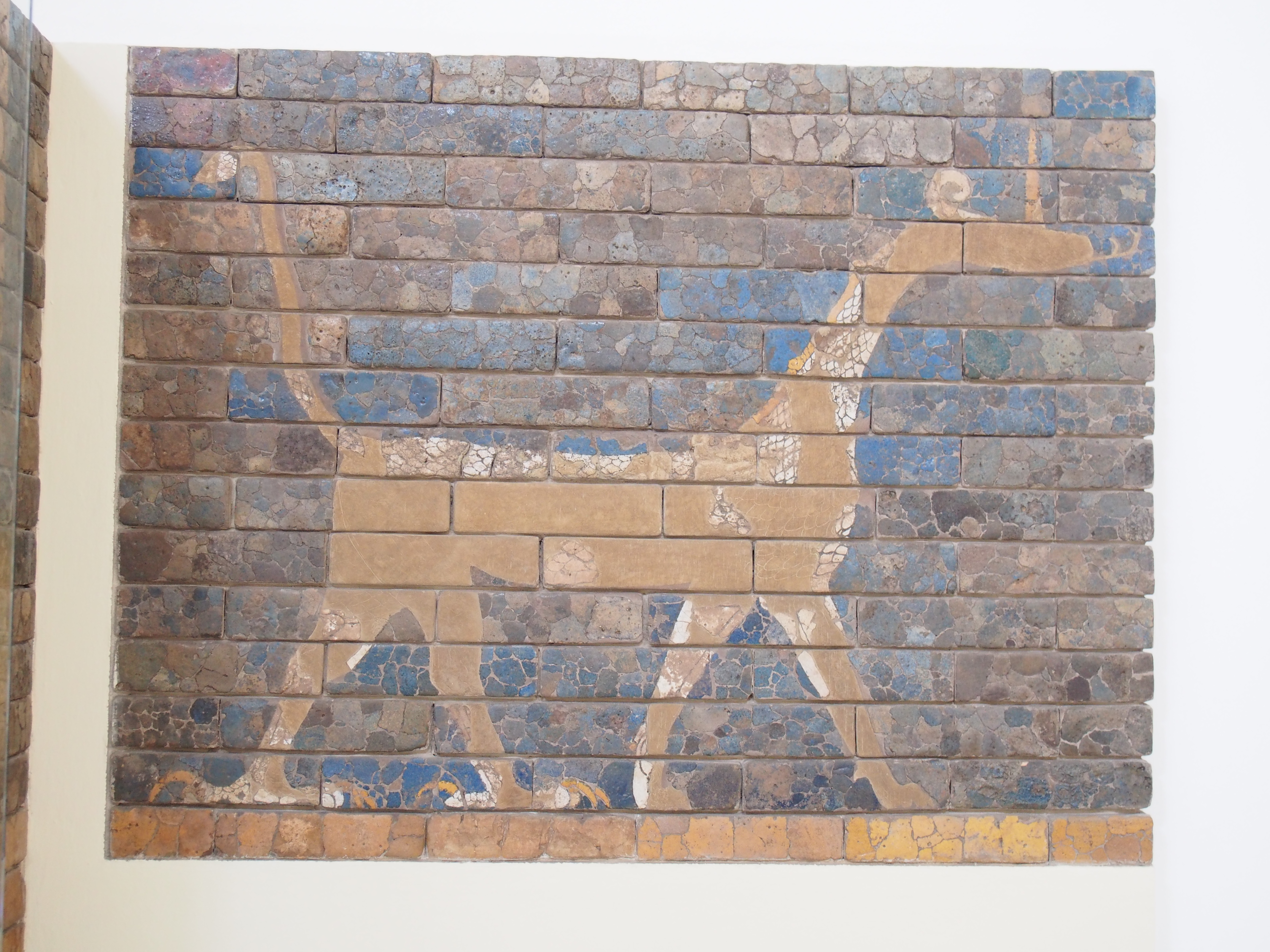 The reconstruction is not 100% original, some of the glazed bricks were not found (shattered into two small fragments?) and they were replaced with modern reproductions when erected … the rosettes above and below the animals, for example, are almost entirely replacements based on the few surviving fragments.