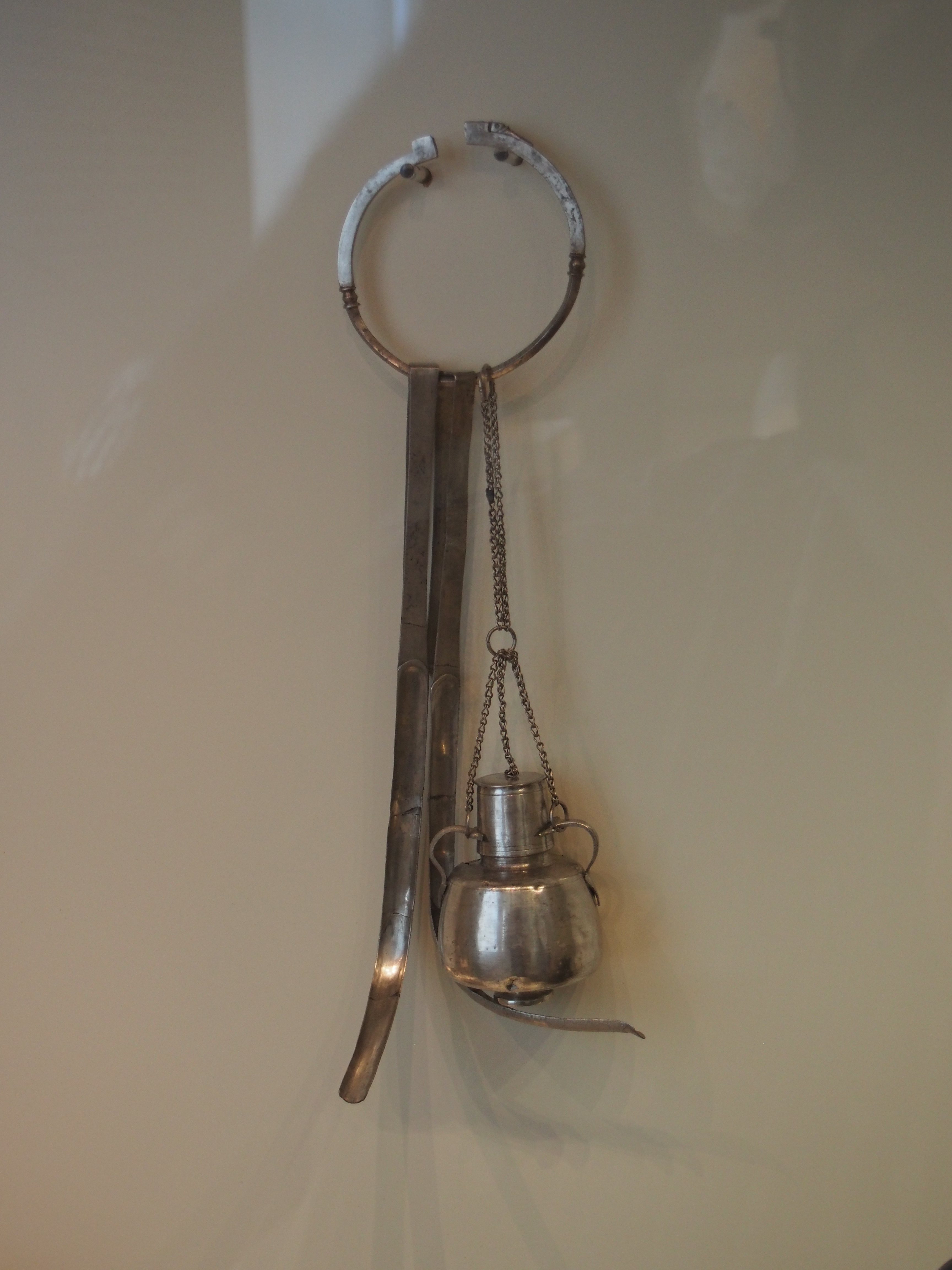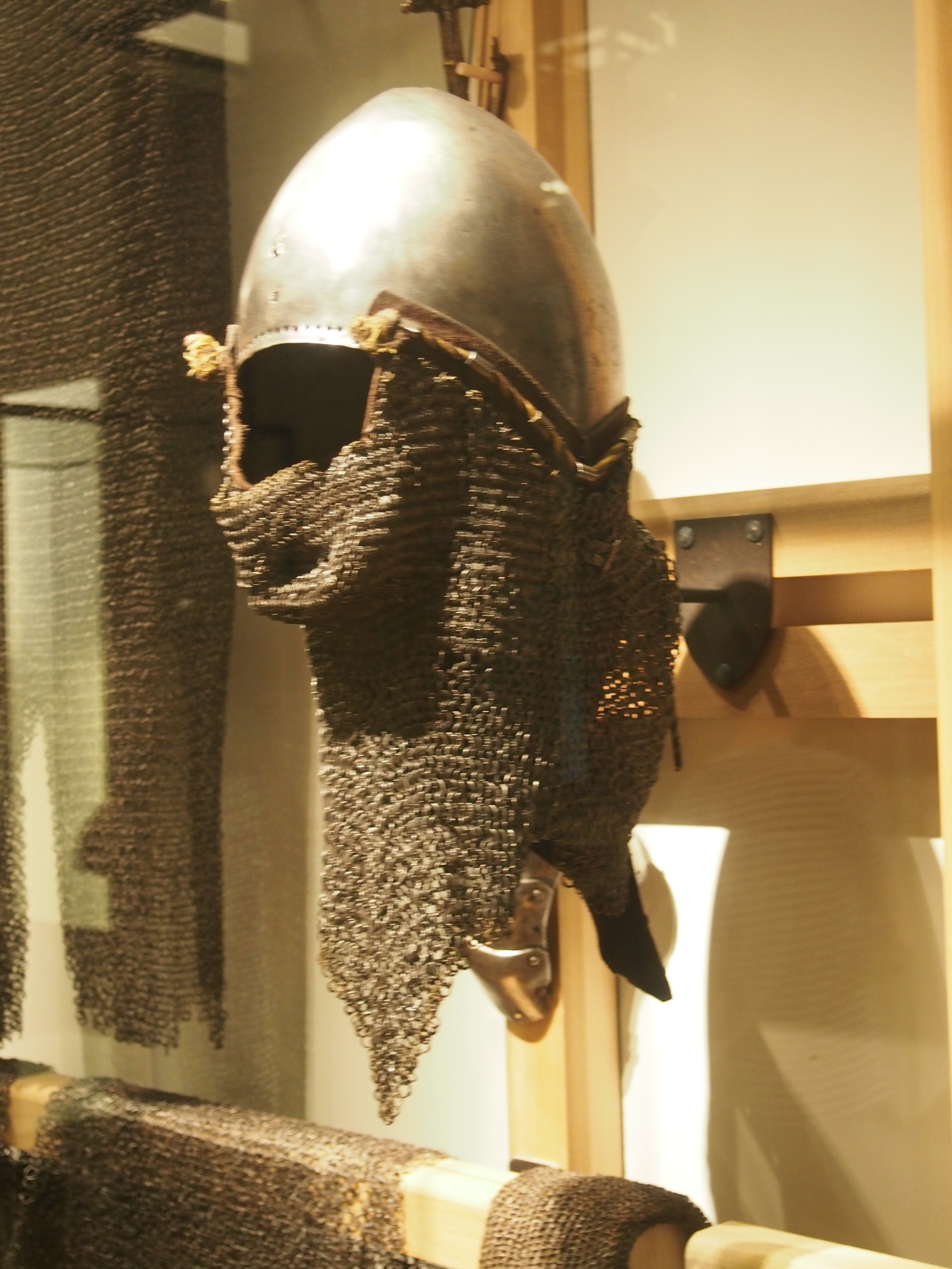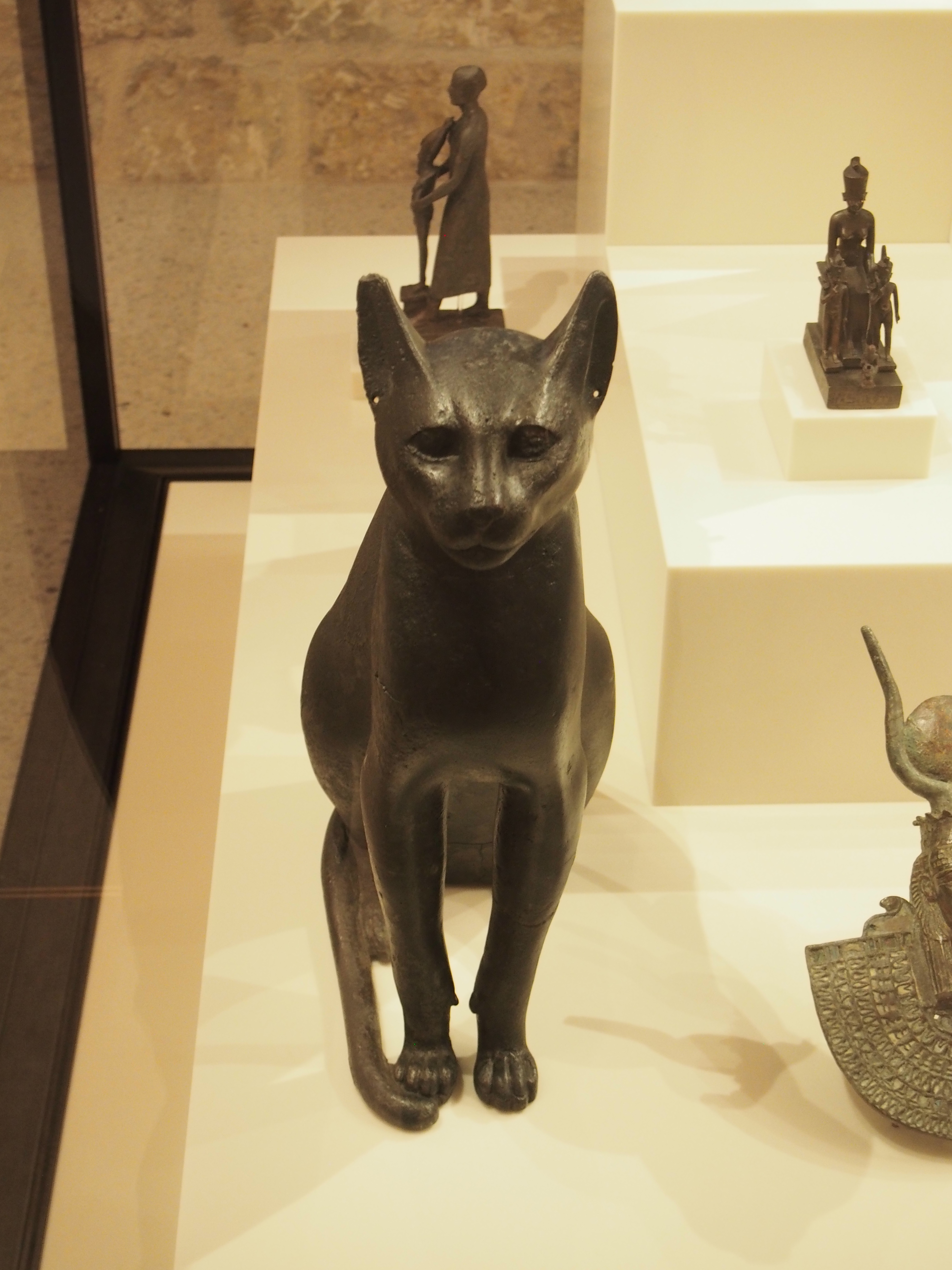 What’s an Egyptian Museum without a statue of Bastfor cat lovers?And ritual cart statues – sadly, as is almost always the case, the golden earrings that were in the statuettes pierced ears were long gone by the time it was discovered,A nice set of Canopic Jars – to contain the internal organs removed during the mummification process.Gold jewellery and other items from high status burials – evidently Gold was something of a royal monopoly and only high status individuals would be granted the right to possess any, either as direct gifts of jewellery from the royal court or as raw gold to have their own pieces made to order.On the upper floors there is some surprisingly interesting Roman stuff – like this very well preserved example of a warded roman barrel padlock and original chains.And the remains of a set of Phalerae, silver medallions issued by the Emperor to soldiers, usually Centurions and above, as rewards – sort of like a cross between a Medal for Valour, a Campaign Medal and a retirement bonus (it wasn’t uncommon for such awards to be made multiple times to a single individual – and you could only actually wear one of them). They were evidently worn attached to a leather harness which was worn over the armour.And there’s the usual suits of plate armour – most of it late Medieval or even early Renaissance.Though some of it is much earlier – like this piece, probably 11th or 12th century.