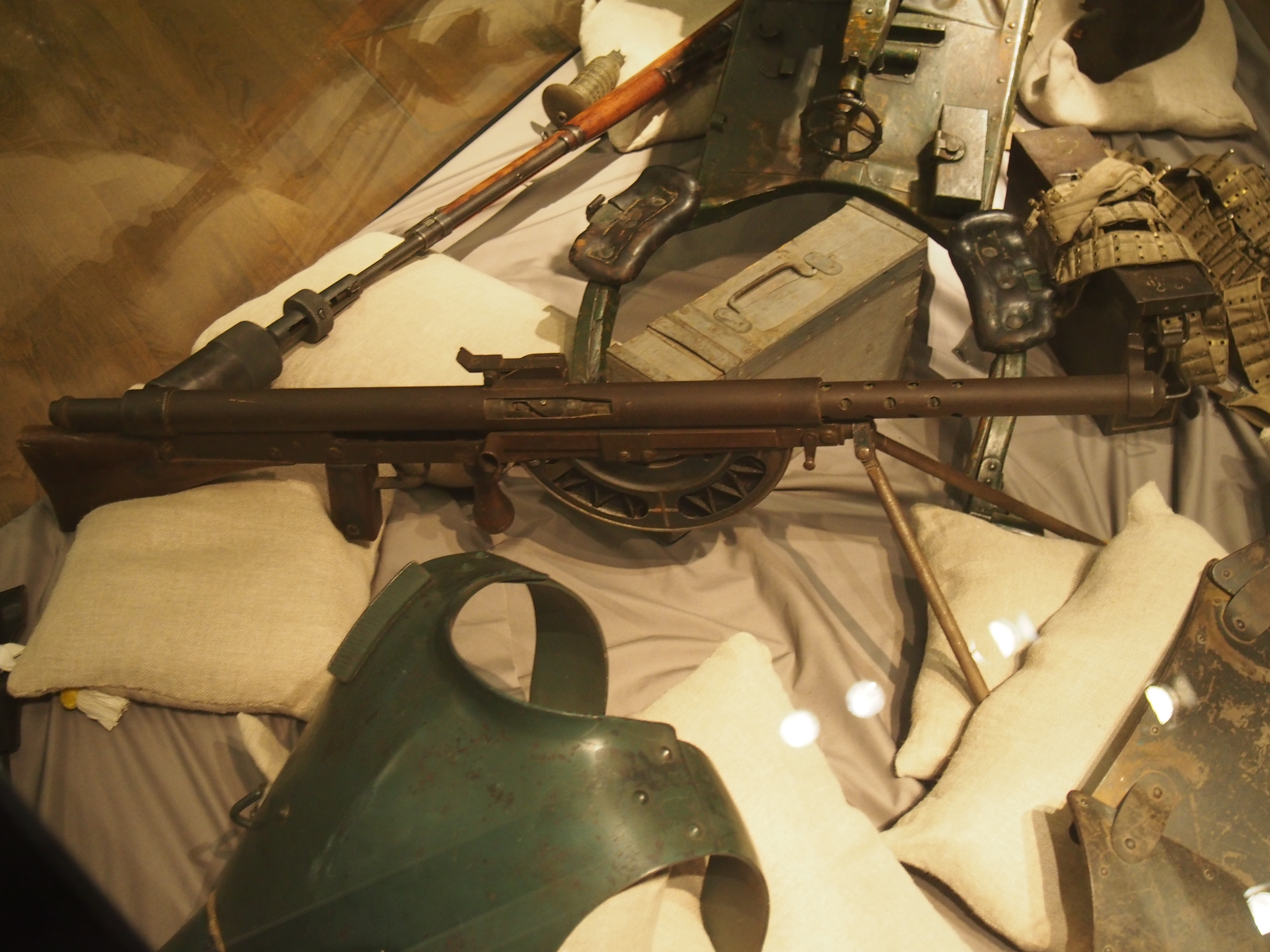Miscellanea from the WW1 section – that’s the absolutely horrid and infamous Chauchaut Light Machinegun in the centre. More ways to jam than operate properly – semicircular magazine because of the tapered French rounds it used. An absolute abortion – but the French didn’t have anything better and the US also used as they didn’t, either.Same display case as above, different angle – Maxim MG-08 in front.