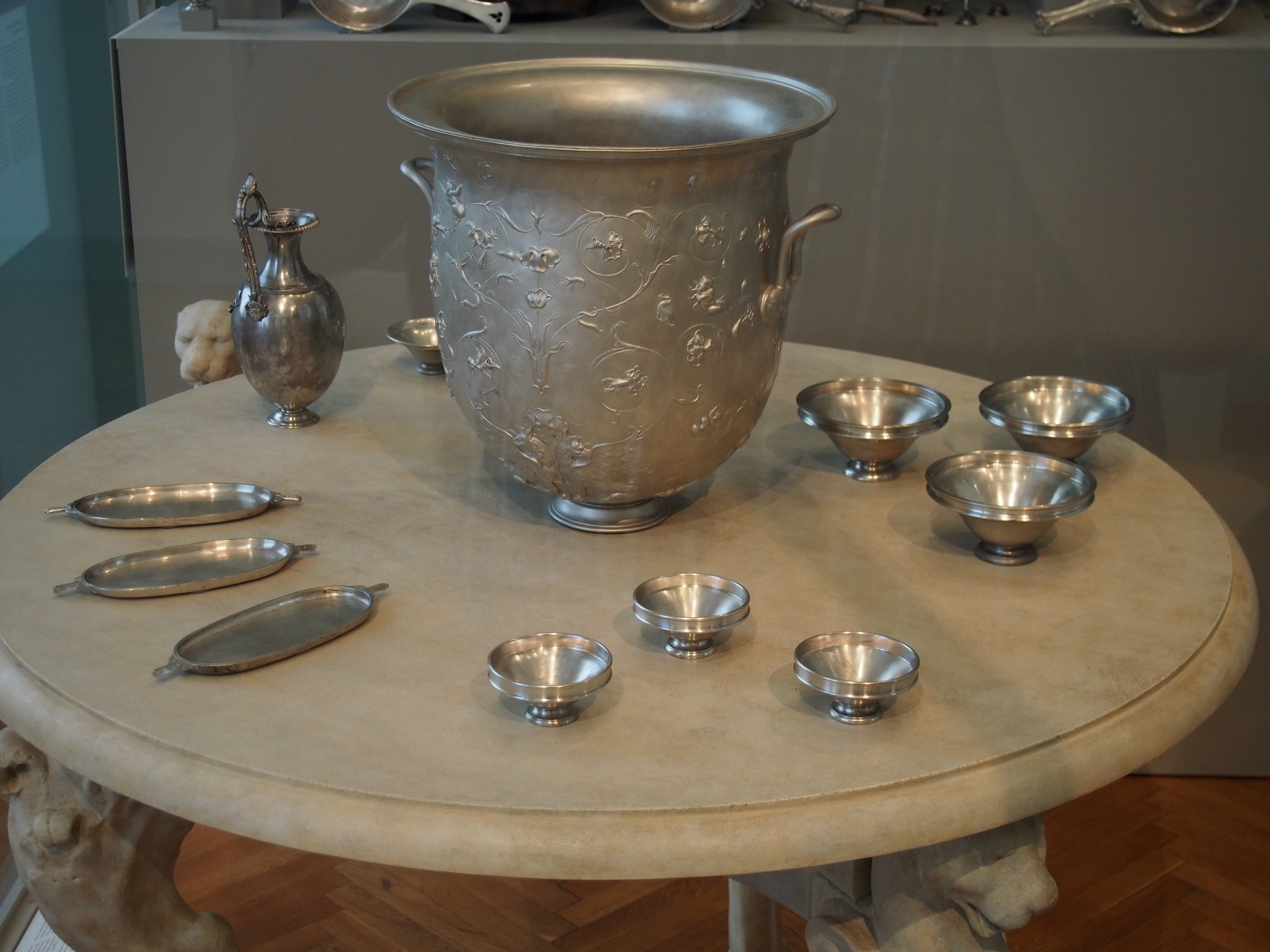 Looking suitably neoclassical.Greek (Corinthian) style Hoplite Helmet of the 5th century BC (or so)Ever wonder how to keep clean without soap? This is the Roman solution – the small silver pot is for olive oil and the silver rod with the curved end is astrigil (‘scraper’). You go to a Roman Bath and work up a sweat to open up the pores and then you cover yourself with olive oil to soak up the dirt and unwanted bodily oils and then you use the strigil to scrape it all off. Simple? Not really – it was notoriously difficult to impossible to do it effectively by yourself and you either had to have a slave/servant of your own or a hired slave/servant at the Baths assist you (doing your back, for example).Classical Greek? Hellenistic? Byzantine? Heck, I forget – nice work though!Reconstruction of a famous (lost) statue pair of two gods armed and equipped (but not armoured) as Hoplites. Like all classical graeco-roman statues they are painted in lifelike colours.A selection of table silver from one of the several large finds from the late Roman period – hidden during the invasions/collapse and never recovered.