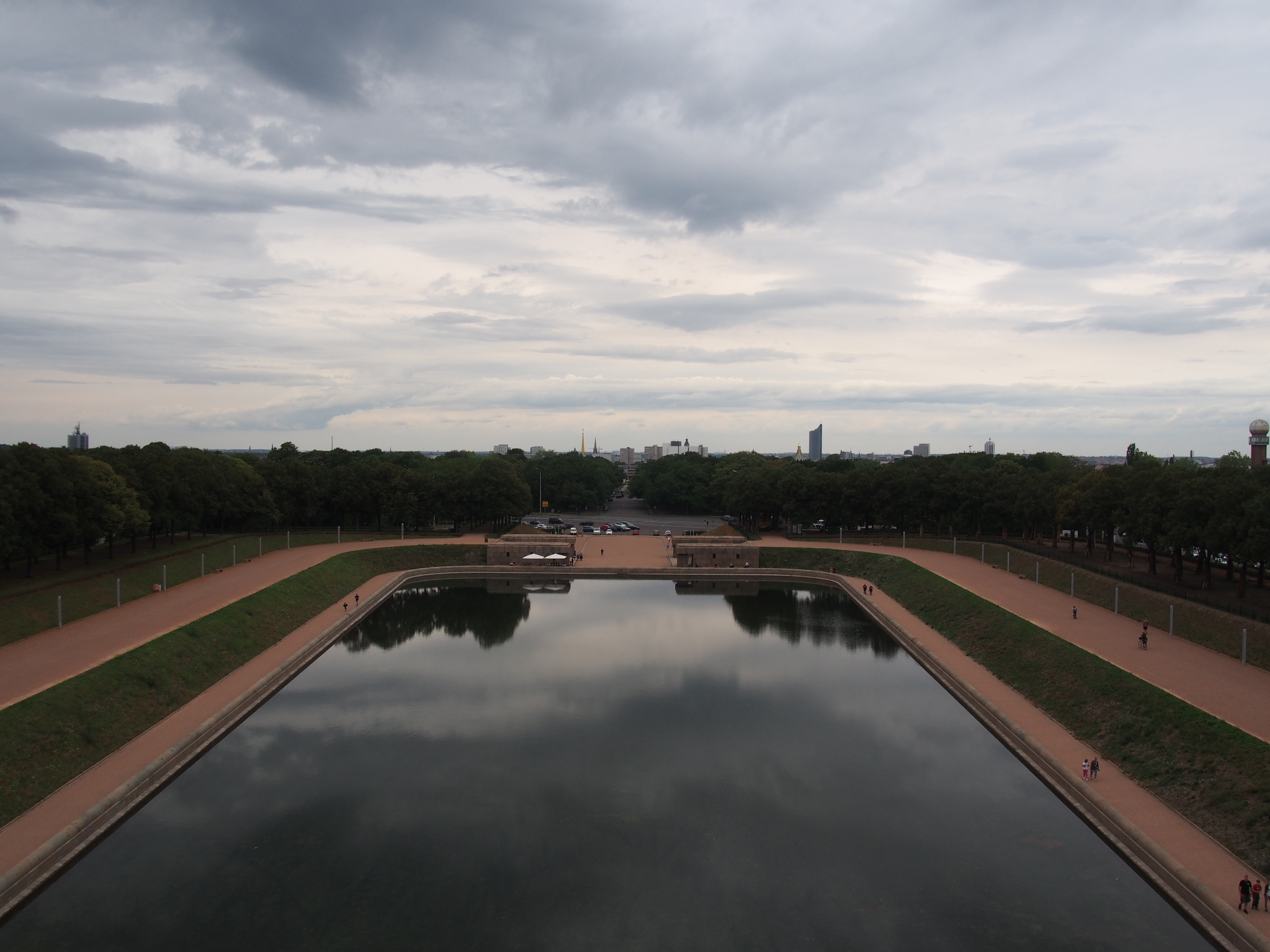 View over the reflecting pool – it doesn’t show, but the tower is 260 metres high and the base is 230 meters wide!The Crypt – not quite a ‘Tomb of the Unknown Soldier’ – the people on the upper walkway give an idea of the scale of the interior space here!Leipzig across the Reflecting Pool taken from the main entry level.
