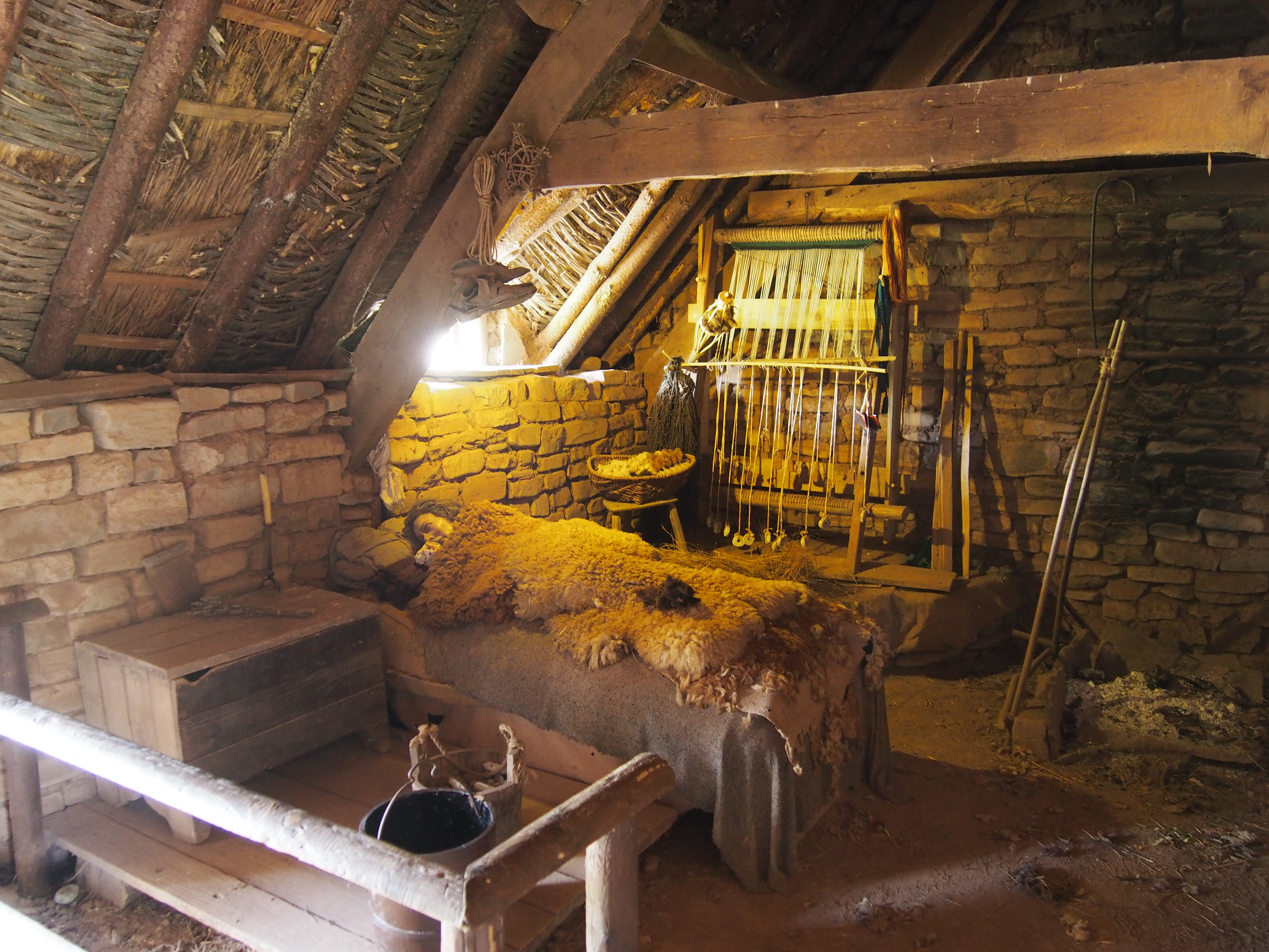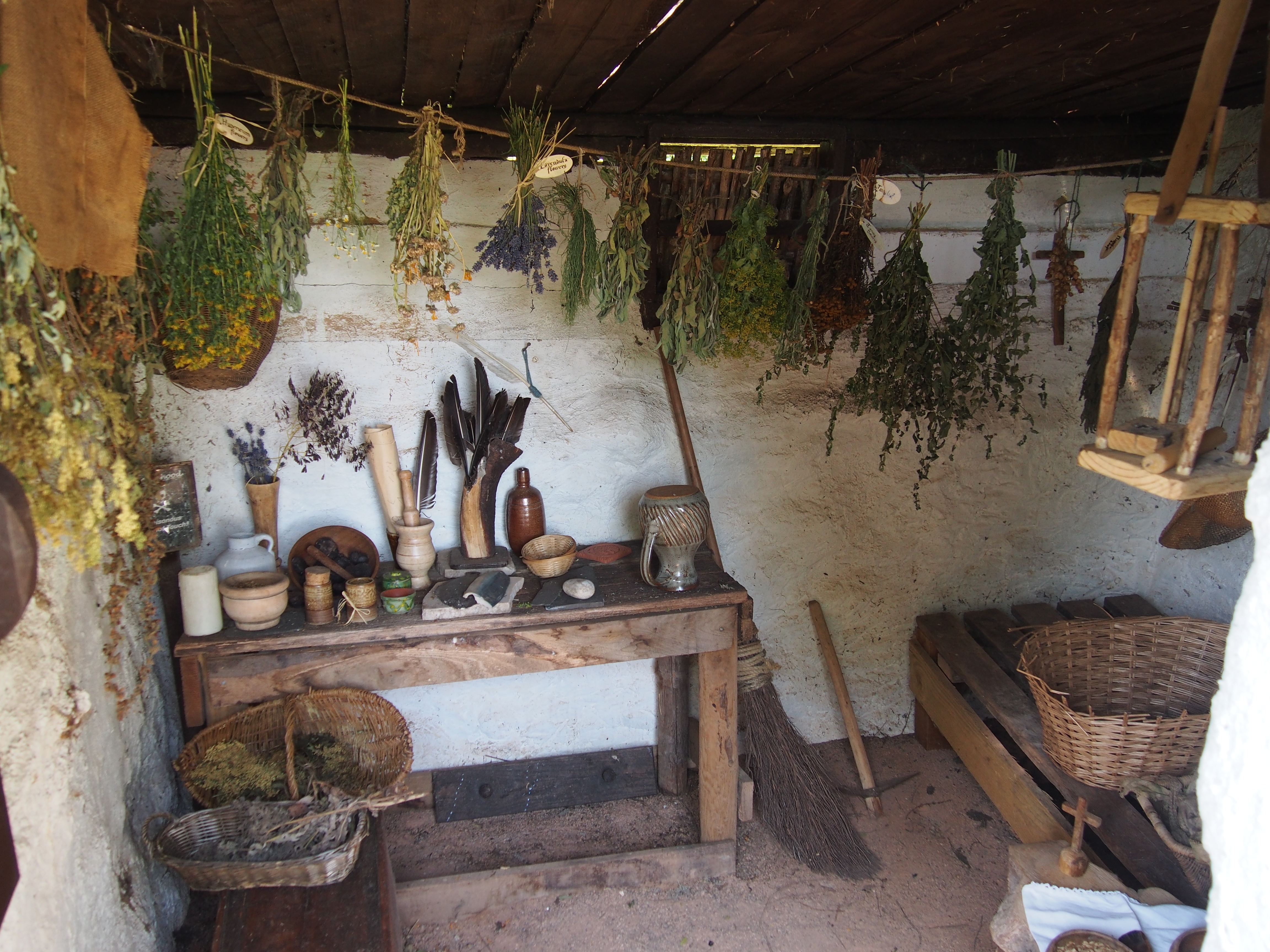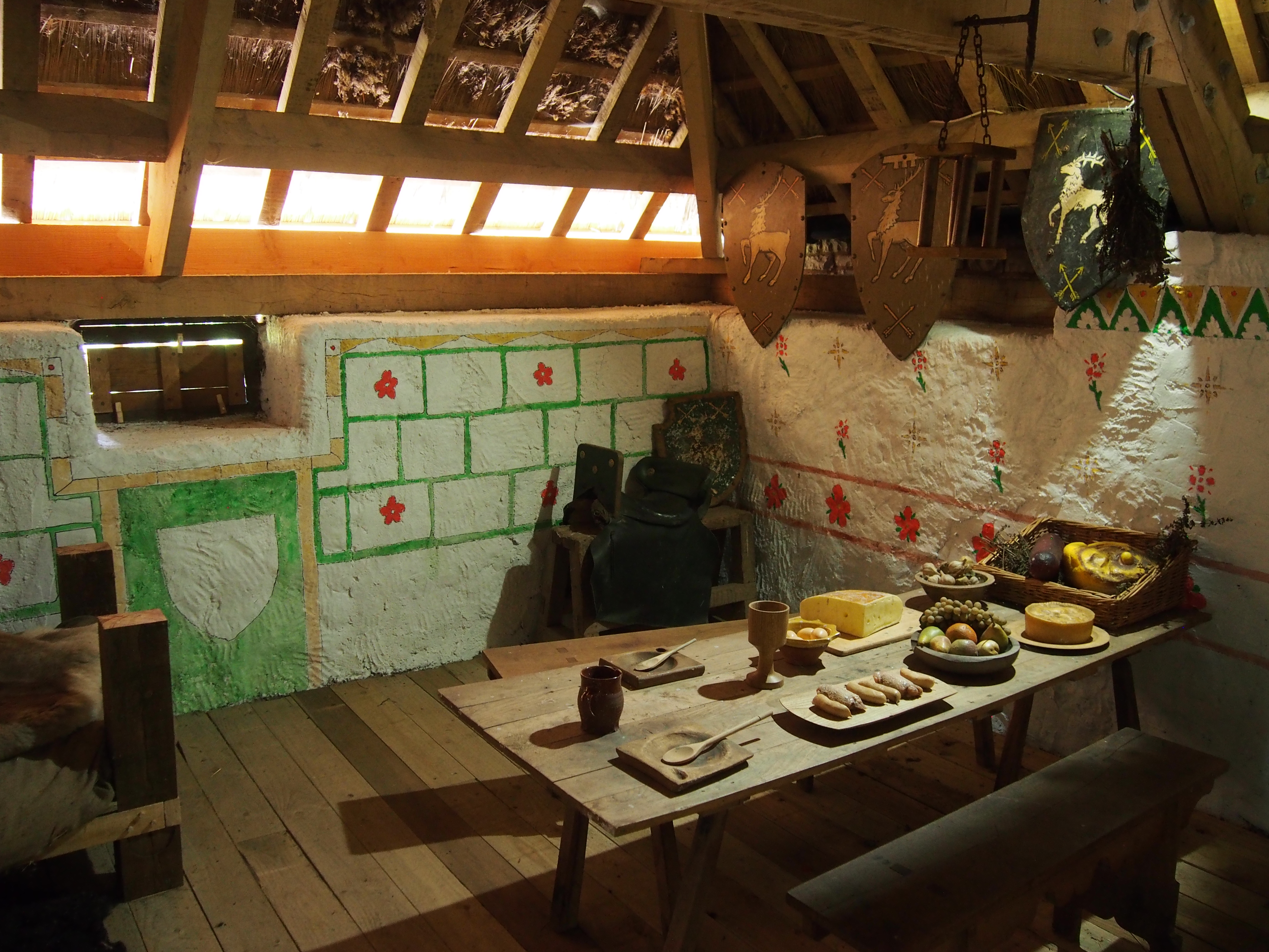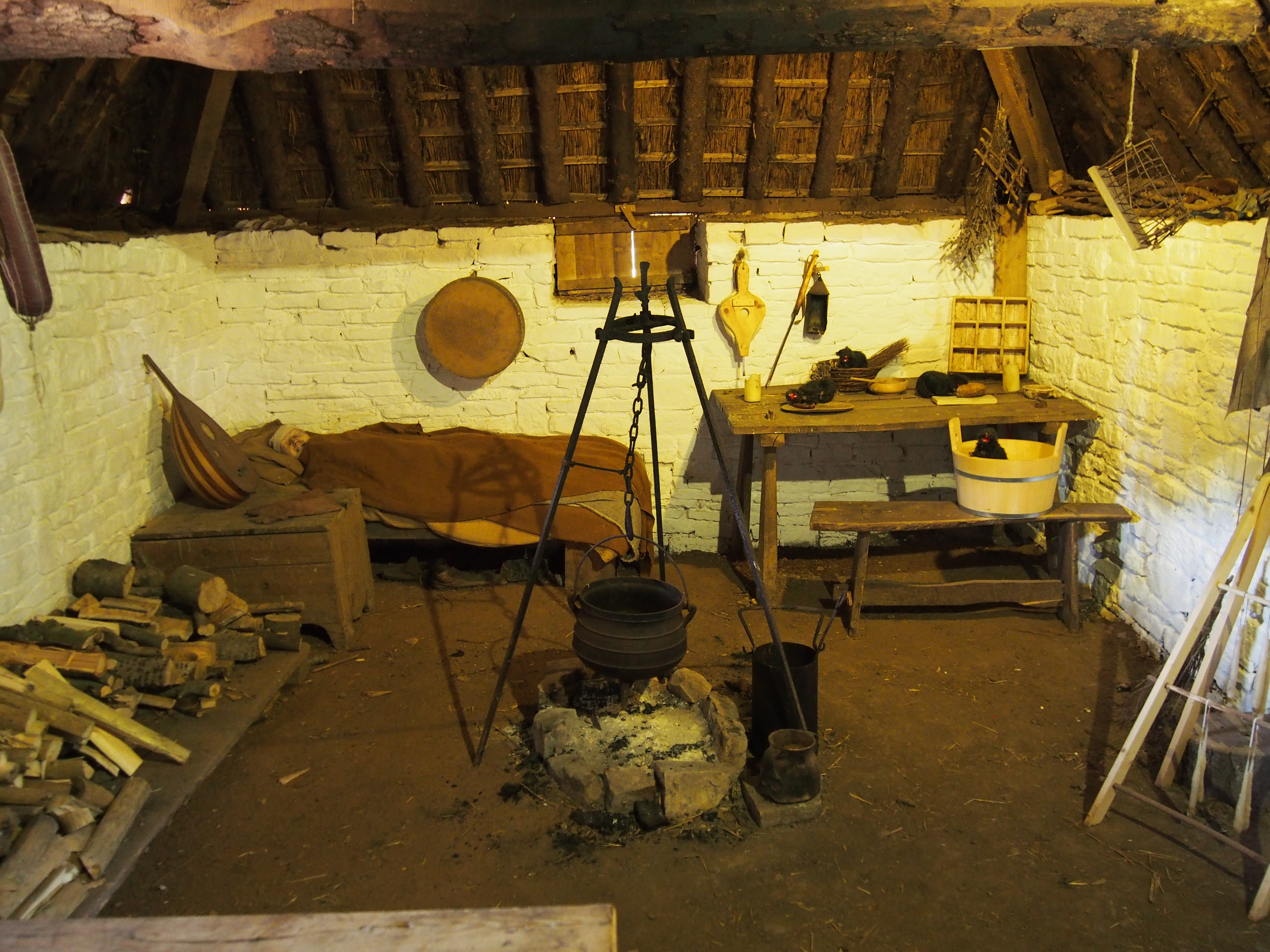 Herbalist’s Work Shed, probably belonging to the Parish Priest. There is a small representative herb garden out the back, but the original would probably have been much largerThe Bailiff’s House, interior. Notice the luxurious plastered walls which have been whitewashed and painted with simple designs. Also note the expensive pottery on the well appointed table!The Swineherd’s House … also plastered and whitewashed, which was unusual, but evidently the Swineherd was unmarried and paid extra for his house to be plastered so that the Lord’s pigs would be extra specially cared for. He lived at one end with stalls for the pigs taking up the other two thirds of the interior. There was also a stone-walled pen at one side.A more typical Peasant’s hut occupied by a Mercenary Archer (retired? seasonally employed? those are Longbow staves in the rack on the wall) … unplastered walls and scant possessions. In this particular case he doesn’t even occupy the whole hut – only half of it. The other half (behind me, and too badly lit to photograph) was occupied by another single guy who was evidently at least a part time fisherman (there’s a nearby lake and the sea was closer back in the day).